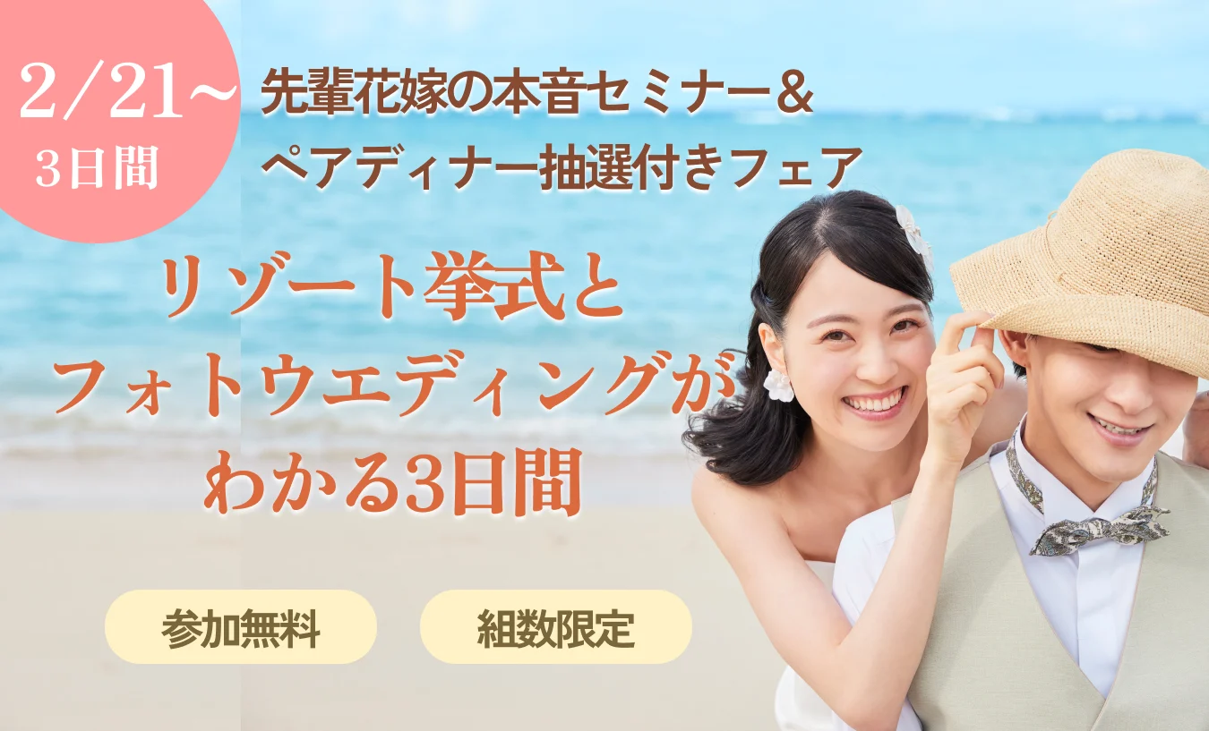 リゾート挙式やウエディングフォトをご検討中のカップル必見!ハワイや沖縄など人気リゾートの挙式相談と、ウエディングフォト・ハネムーンまでまとめて相談できる特別フェアを開催します。さらに、先輩花嫁によるリアル体験談セミナーや、豪華ペアディナー券が当たる抽選特典もご用意!