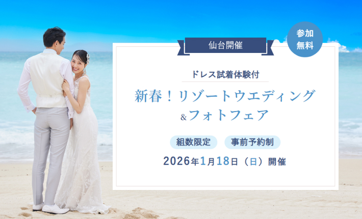 ハワイや沖縄など人気リゾート挙式の相談と、最新ドレス試着体験が叶う特別フェアを開催します。挙式・フォト・ハネムーンをまとめて相談できるこの日だけのイベントです。