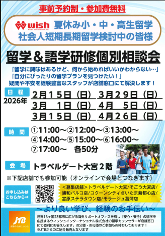 留学を応援する企業【WISH】のスタッフによる留学&語学研修個別相談会を開催します!