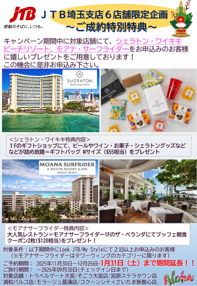 キャンペーン期間中に対象店舗にて、シェラトン・ワイキキ ビーチリゾート、モアナ・サーフライダーをお申込みのお客様に嬉しいプレゼントをご用意しております!