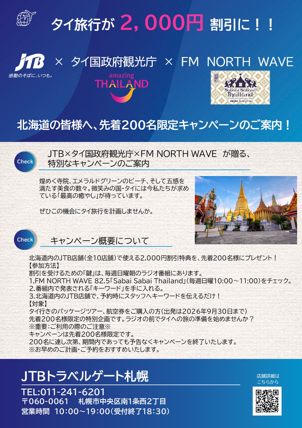 【対象】 タイ行きのパッケージツアー、航空券をご購入の方(出発は2026年9月30日まで)