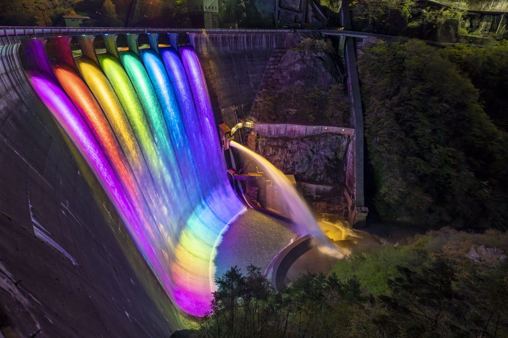 ・ライトアップと音楽で彩る「鳴子ダムレインボーすだれ放流ライトアップ」鑑賞
