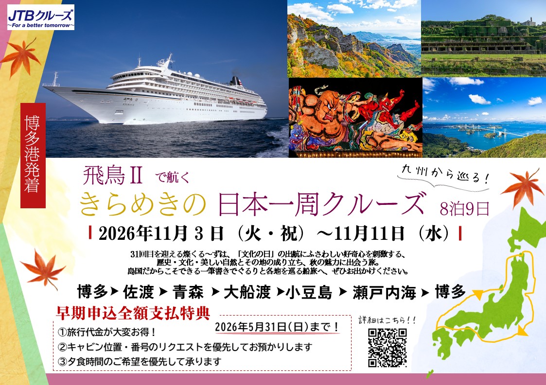日本有数のロングセラーであり、31回目を迎える燦(きらめき)くる~ずは、「文化の日」の出航にふさわしい好奇心を刺激する、歴史、文化、美しい自然とその地の成り立ち、秋の魅力に出会う旅。