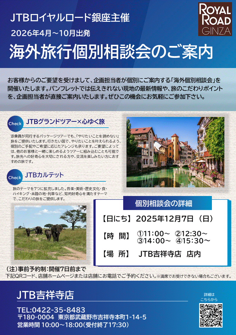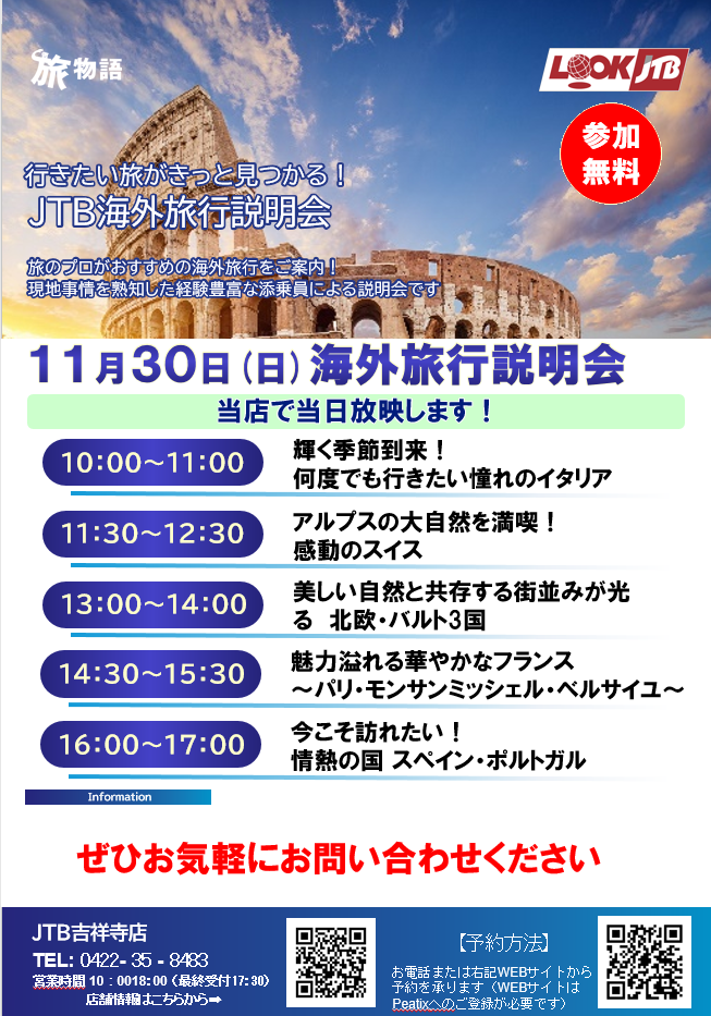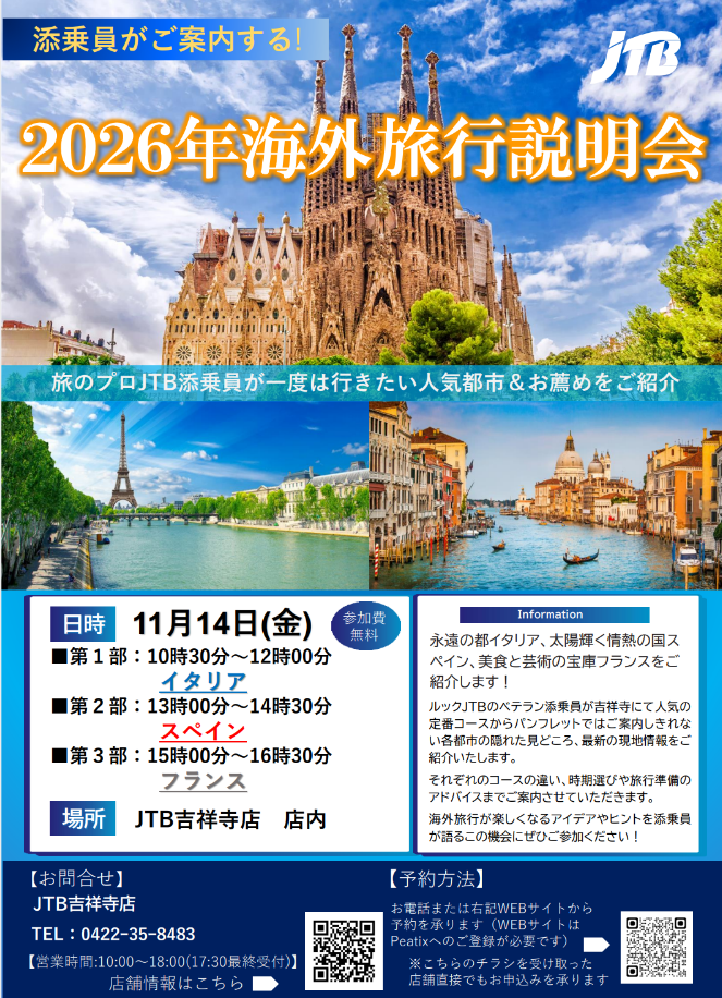今年もルックJTBのベテラン添乗員が吉祥寺にて人気の定番コースからパンフレットではご案内しきれない各都市の隠れた見どころ、最新の現地情報をご紹介いたします!