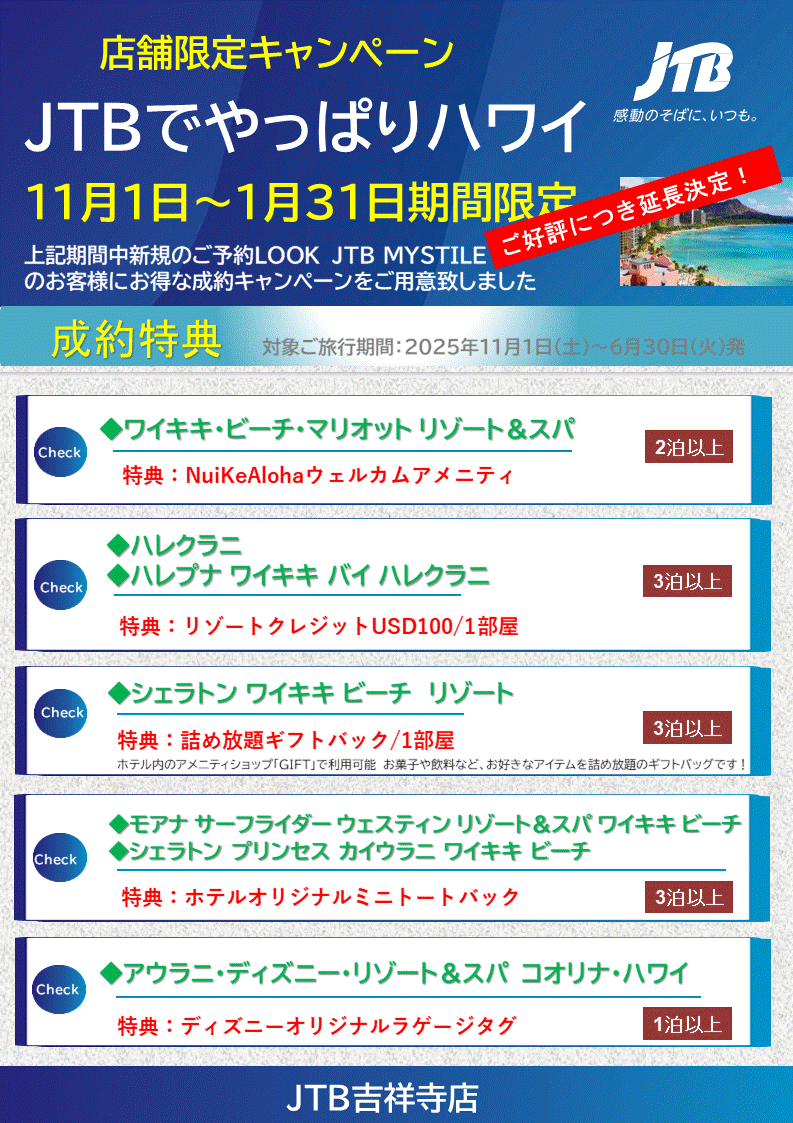 その間対象ホテルや航空会社をご成約いただいたお客様には現地滞在にうれしい特典がございます。