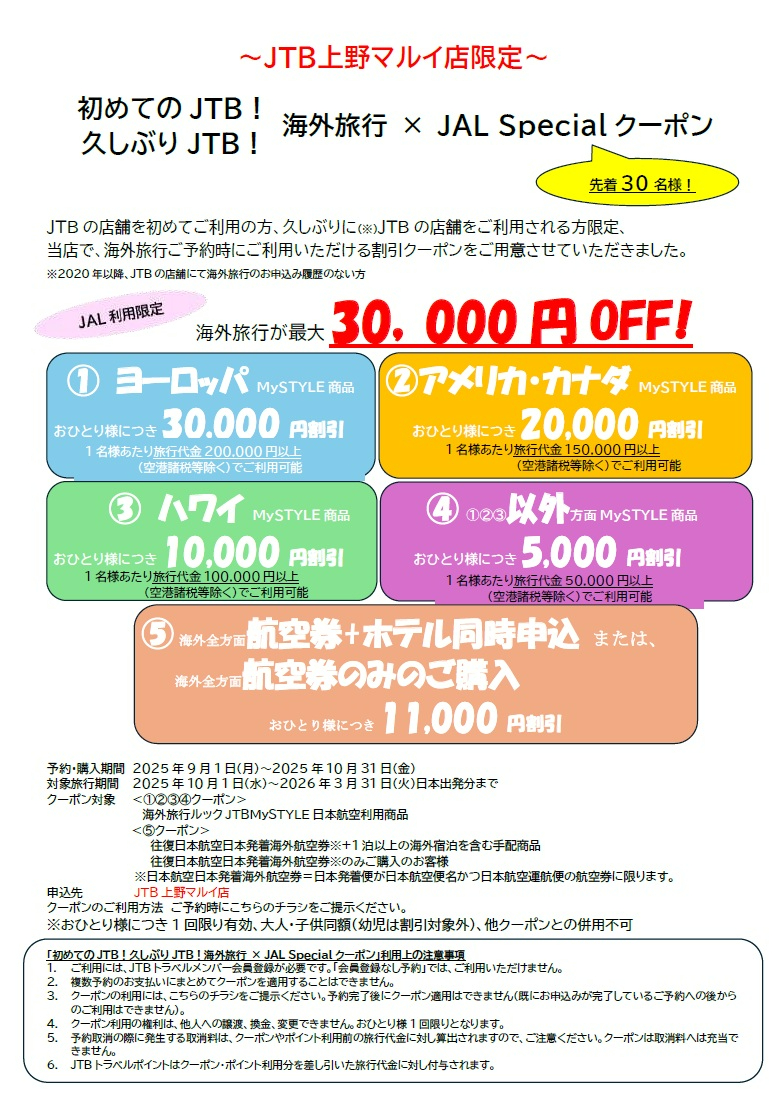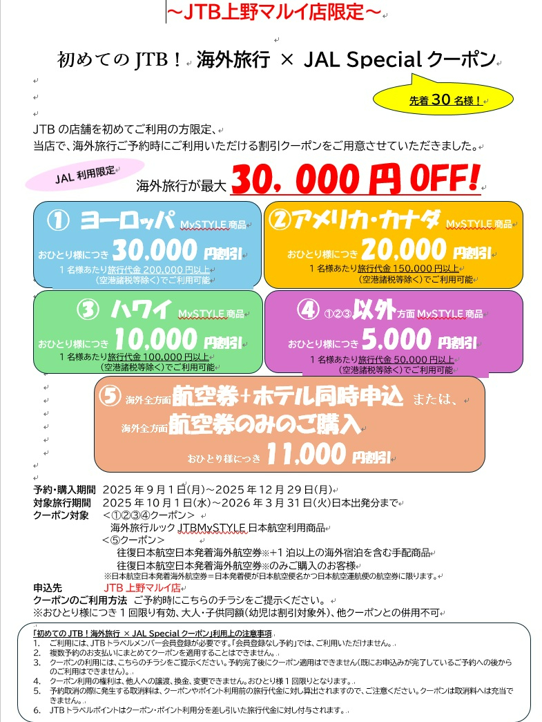 ルックJTBの募集型企画旅行ツアー、もしくは往復日本航空日本発着海外航空券+1 泊以上の海外宿泊を含む手配旅行をご予約いただいた方に、先着で5,000円~最大30,000円のクーポンをプレゼント☆彡