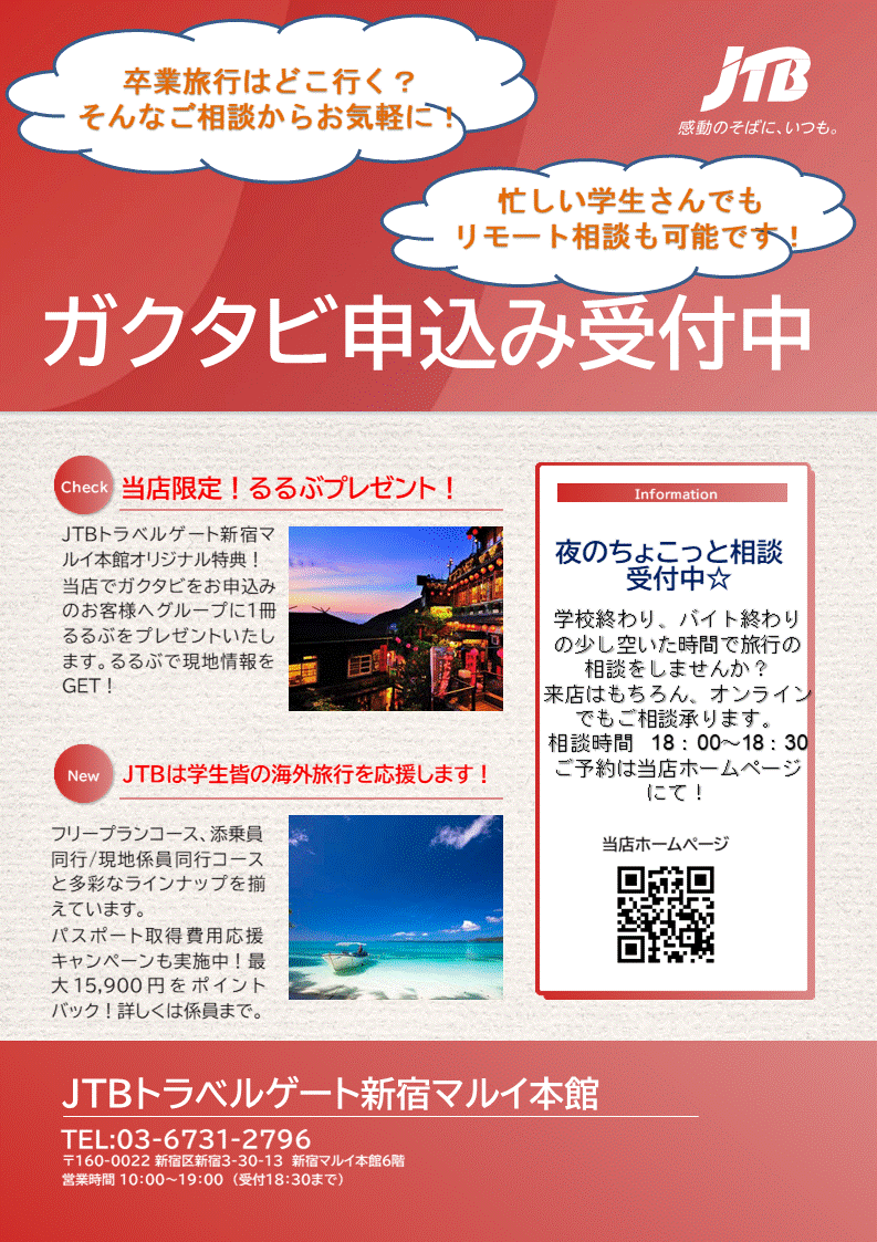 最寄りのJTB店舗で旅の相談&お支払いをすることができますよ。(*)