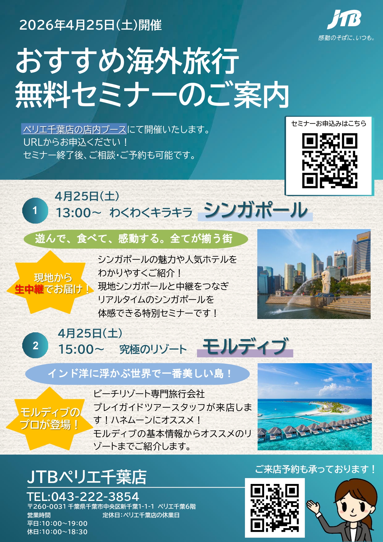 2026年4月25日(土)に海外旅行無料セミナーをJTBペリエ千葉店の店内ブースにて開催いたします。