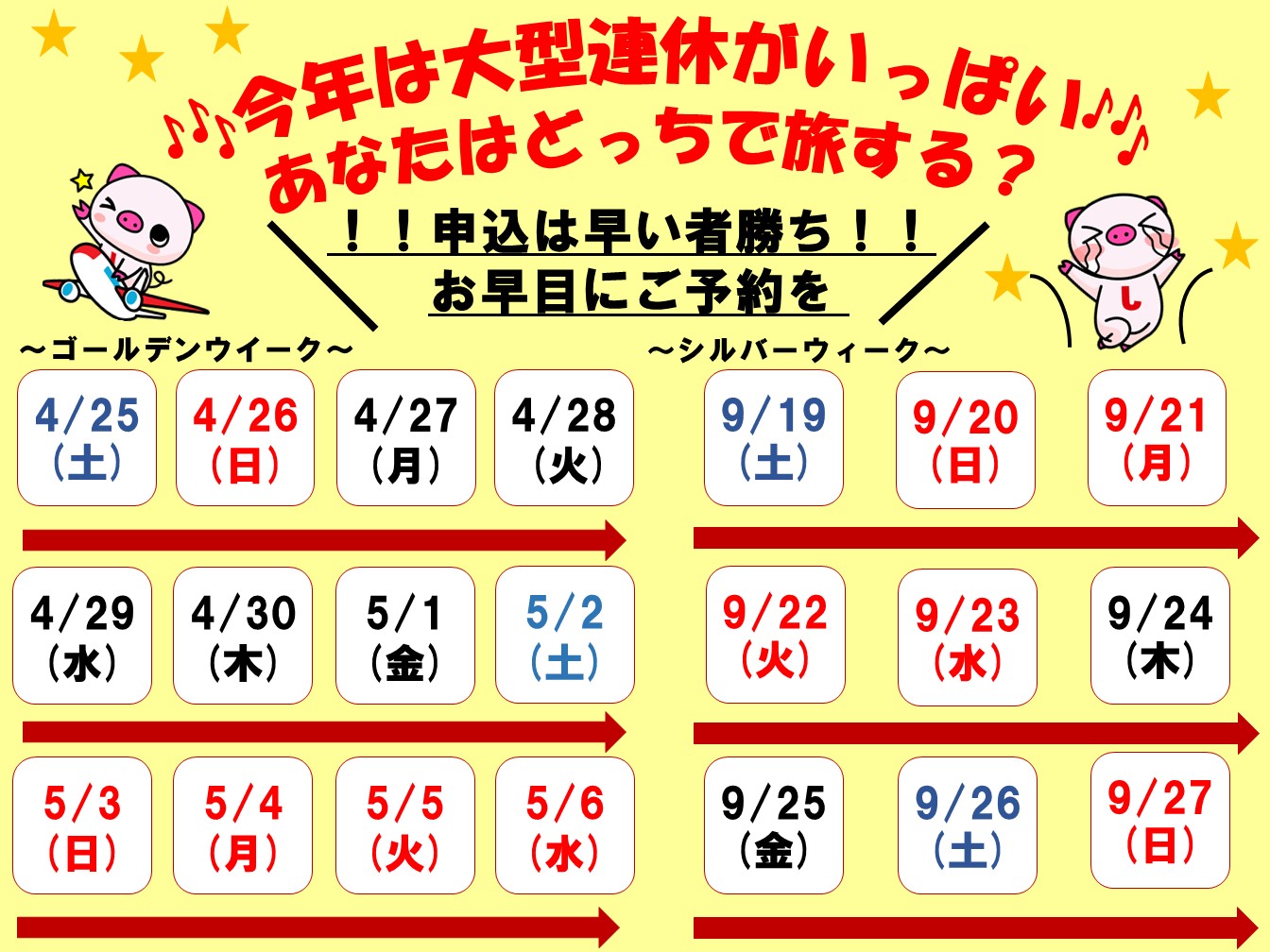 連休は大変混みあいますので、お早目のご計画・ご予約がオススメです🌞