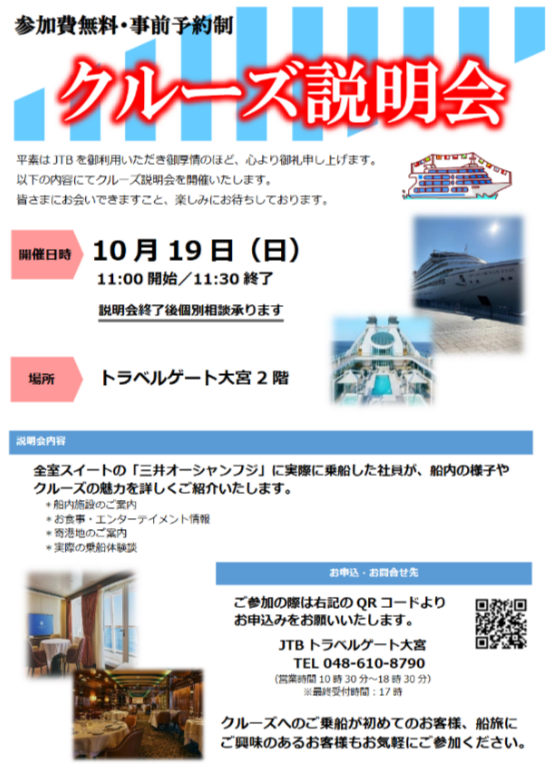 「三井オーシャンフジ」に実際に乗船した社員が、船内の様子やクルーズの魅力を詳しくご紹介いたします。