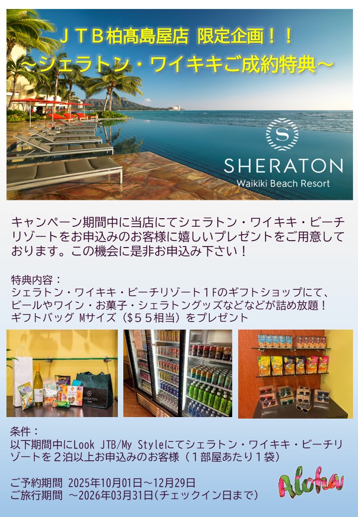 対象商品: ルックJTB MySTYLEハワイ シェラトンワイキキ 3泊以上お申込み