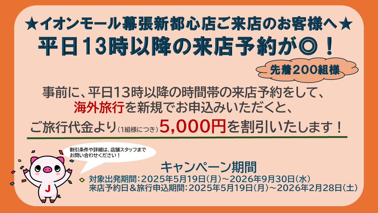 事前に平日13時以降の時間帯の来店予約をして海外旅行を新規でお申込みいただくと、ご旅行代金より1組様につき5,000円お値引きします!