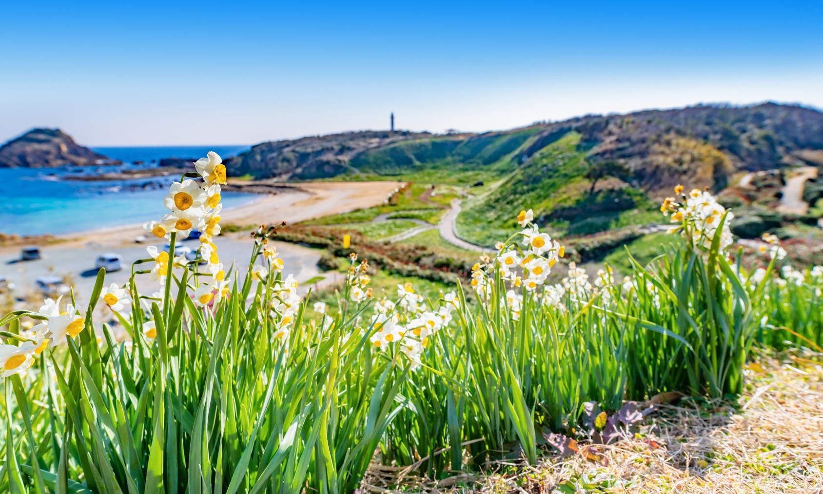 伊豆急下田駅から車で約15分の爪木崎では、約300万本の可憐な水仙が咲き誇り、甘く爽やかな香りに包まれます。手軽に絶景を楽しめるスポットです。おまつり期間中には甘酒のサービスや郷土料理の「池之段煮味噌」(漁師鍋)を味わうこともできます。