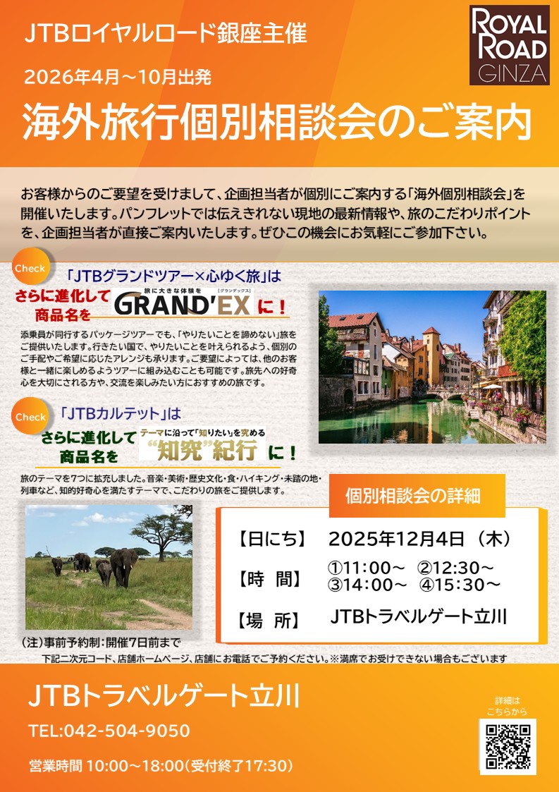 JTBロイヤルロード銀座 2026年4月~10月出発 海外旅行個別相談会
