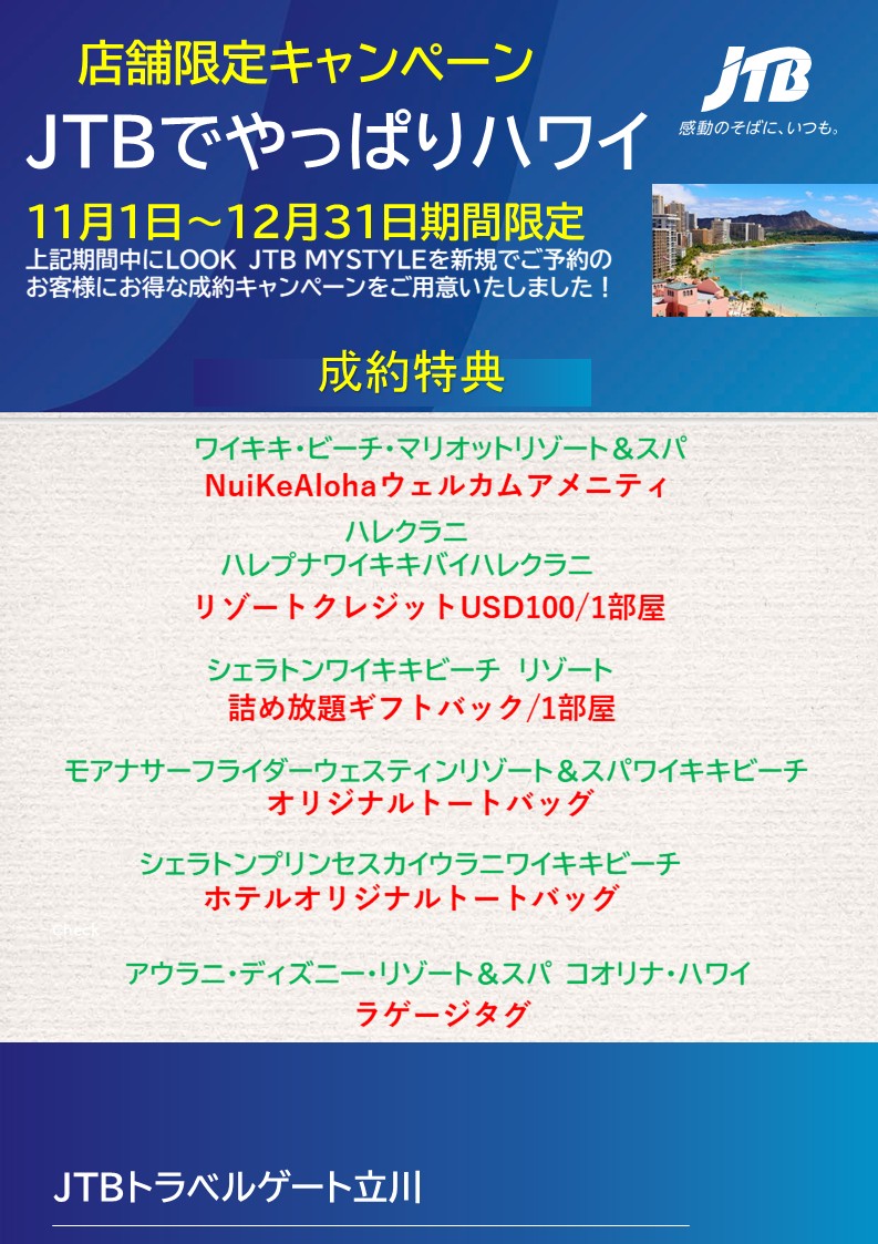 上記期間中にLOOK JTB MYSTYLEを新規でご予約のお客様にお得な成約キャンペーンをご用意いたしました!