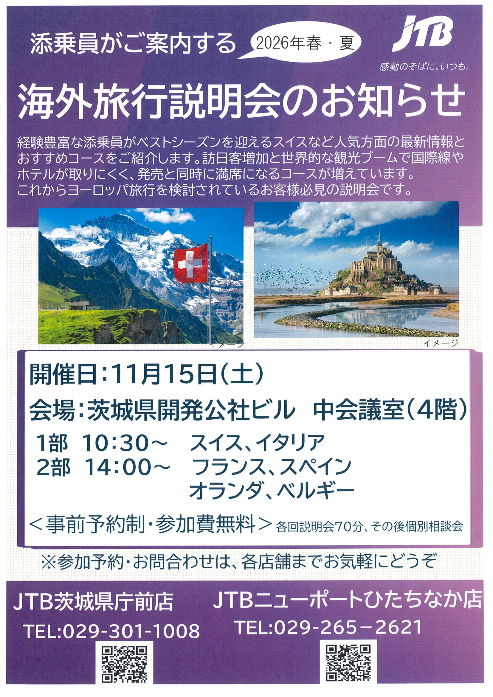お問い合わせ・お申し込みは、JTB茨城県庁前店 TEL:029-301-1008までお申し付けください。