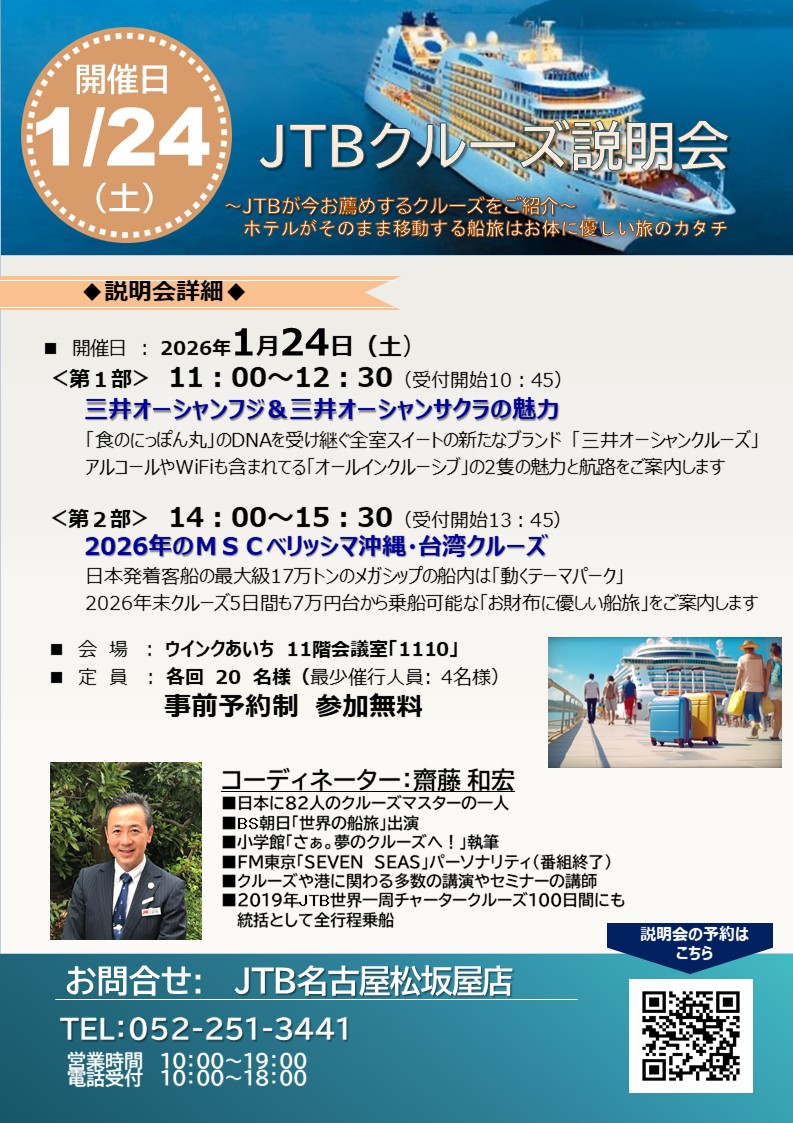 JTB名古屋松坂屋店 直通TEL 052-251-3441(10:00~18:00)