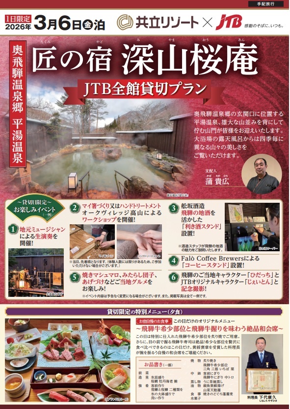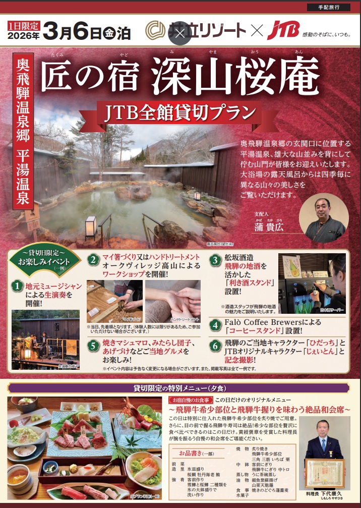 是非ご夫婦、ご家族、三世代の旅行に、雪景色や温泉とともに、奥飛騨の味覚やワークショップが体験できる「特別宿