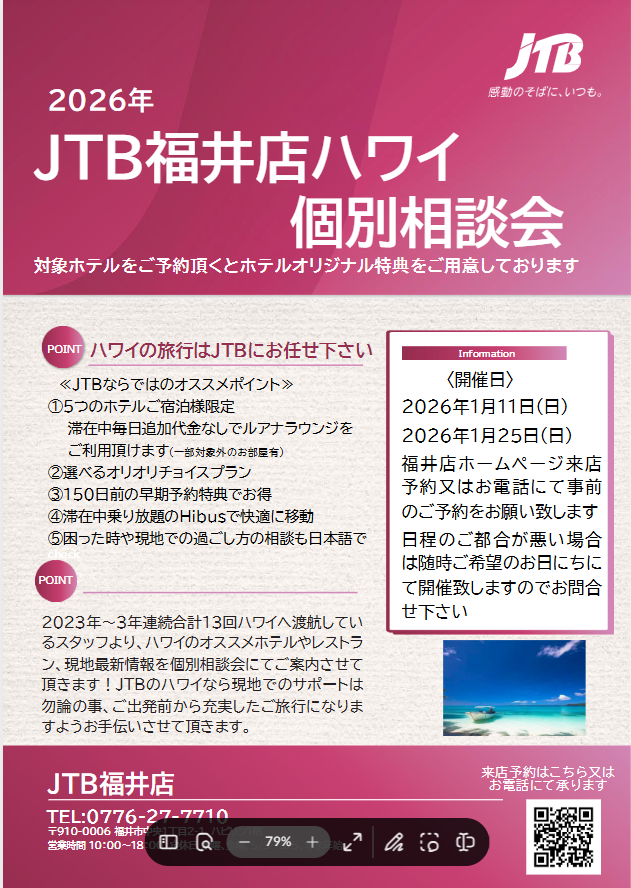 ハワイへのご旅行をご検討中の方は是非JTB福井店へご相談下さい!
