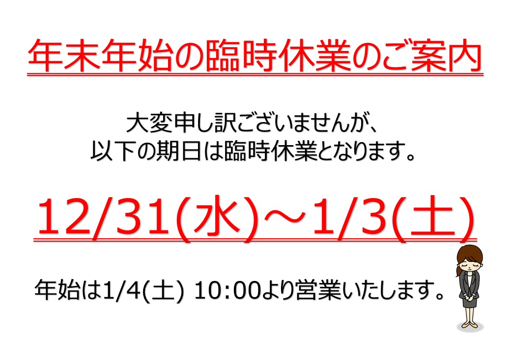 休業日中の変更・取消は、お客様にて関係機関すべてへ取消のご連絡をいただいたのち、1/4(日)営業開始後に、当店までお申出ください。その際、各関係機関の電話口の担当者名もお知らせください。