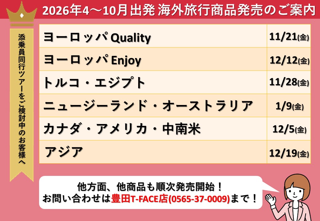 お問合せはJTB豊田T-FACE店(0565-37-0009)まで。