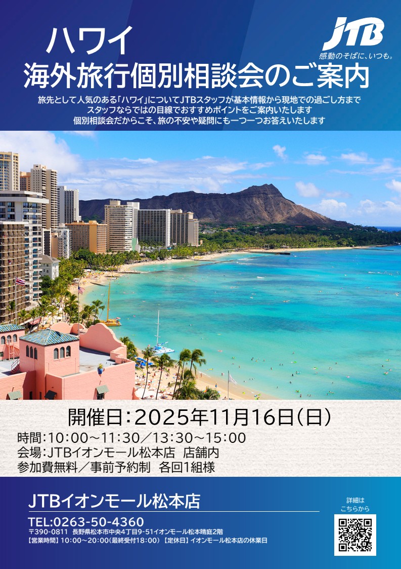 旅先として人気のある「ハワイ」についてJTBスタッフが基本情報から現地での過ごし方まで、スタッフならではの目線でおすすめポイントをご案内いたします。個別相談会だからこそ、旅の不安や疑問にも一つ一つお答えいたします!
