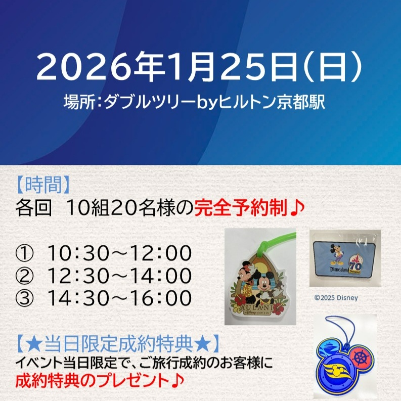 当日は、ハワイのリゾート滞在のアウラニ、本土のテーマパーク「ディズニーランド・リゾート」と、どちらも現地に行って滞在し、感動して帰ってきた詳しいスタッフがご相談をお伺いいたします。
