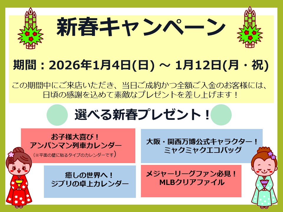 この期間中にご来店いただき、当日ご成約かつ全額ご入金のお客様には、日頃の感謝を込めて素敵なプレゼントを差し上げます!
