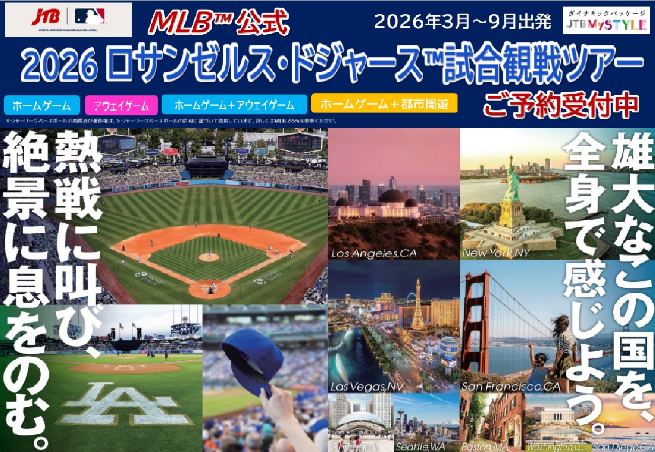 JTBはMLB™(メジャーリーグベースボール)のアジアにおけるトラベル&ホスピタリティ事業のオフィシャルパートナーです。さらに、2025年に日本の旅行会社として初めての「オフィシャルパートナー・オブ・ザ・ロサンゼルス・ドジャース」となりました。