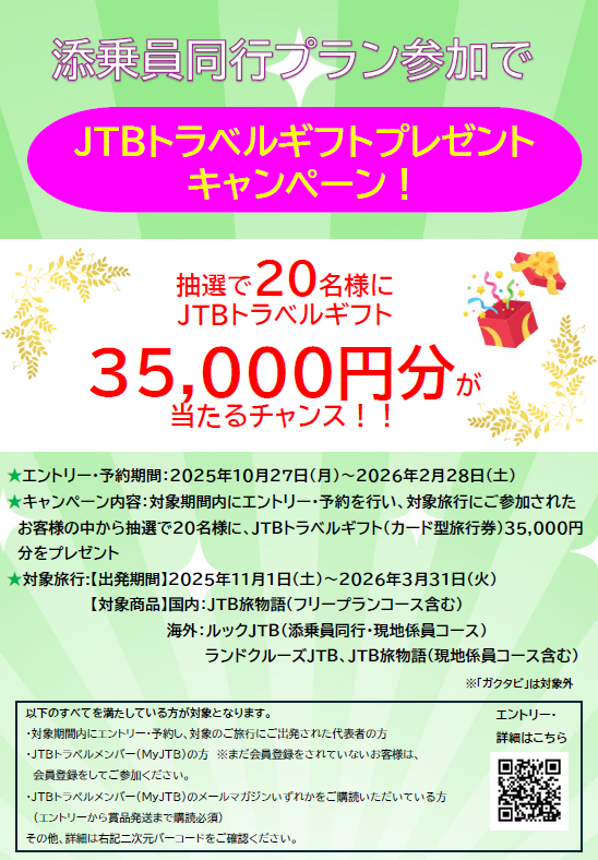 対象期間内にエントリー・予約を行い、対象旅行にご参加されたお客様の中から抽選で20名様に、JTBトラベルギフト35,000円分をプレゼント!