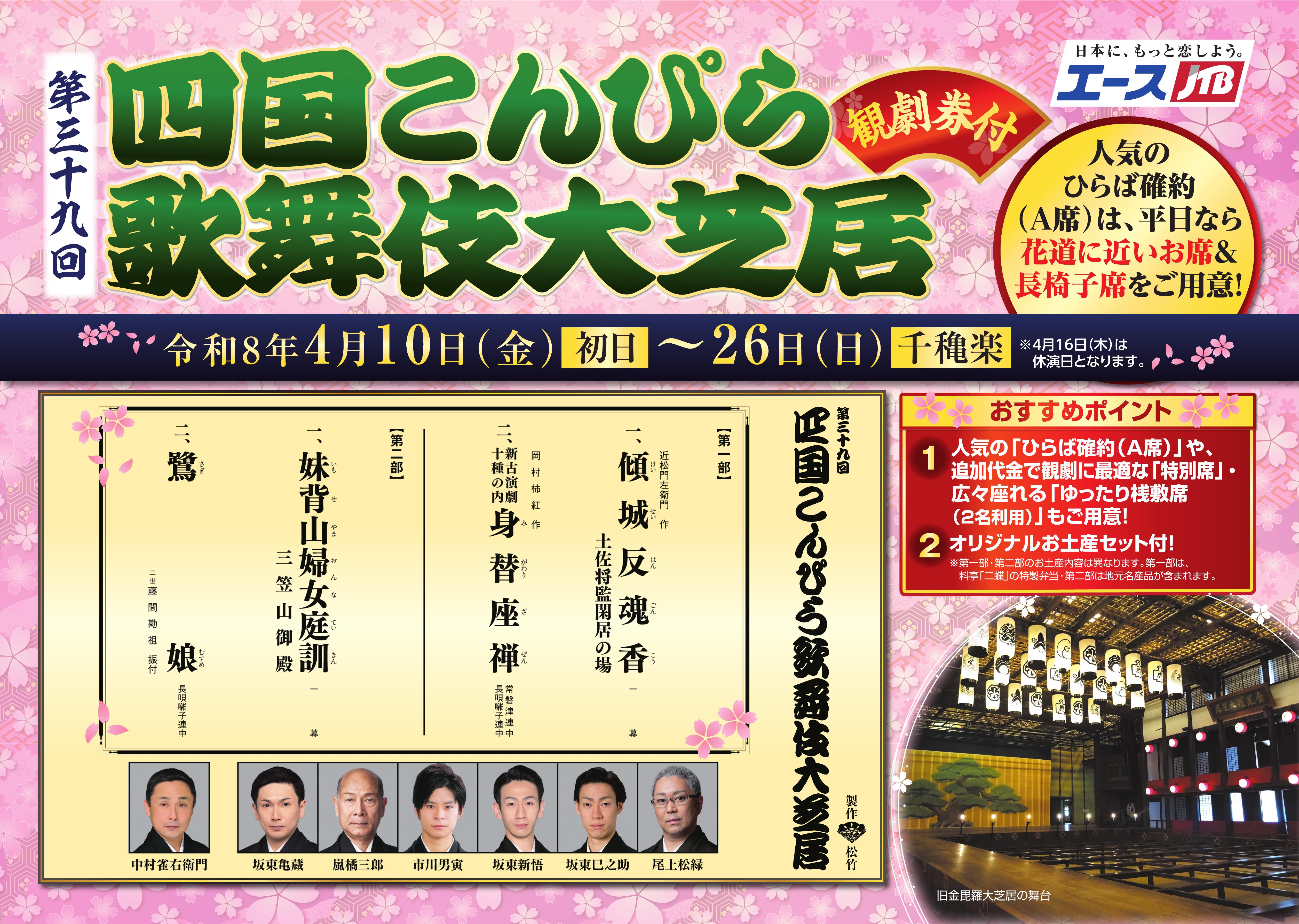 人気の「ひらば確約(A席)」をはじめ、追加代金で「特別席」や広々とした「ゆったり桟敷席(2名利用)」も選択可能。さらに、「ひらば確約(A席)」の平日観劇なら花道に近い長椅子席を確約。全プランにオリジナルお土産セット付きで、第一部は料亭「二蝶」の特製弁当、第二部は地元名産品をご用意しています。現存する日本最古の芝居小屋の人力舞台装置や江戸時代の雰囲気を体感しながら、春の風物詩である歌舞伎公演をお楽しみいただけます。