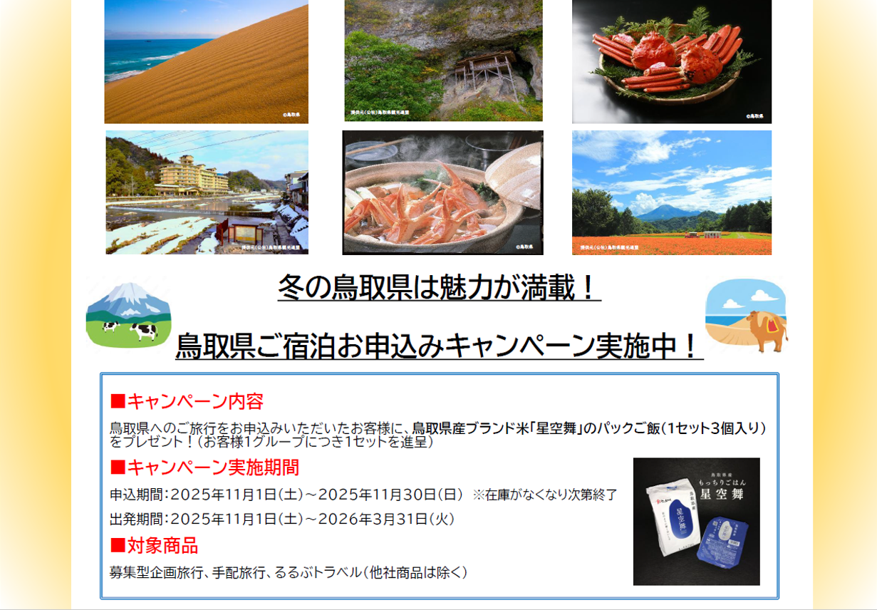 対象期間に鳥取県へのご旅行をお申込みいただいたお客様に、特典をプレゼント!