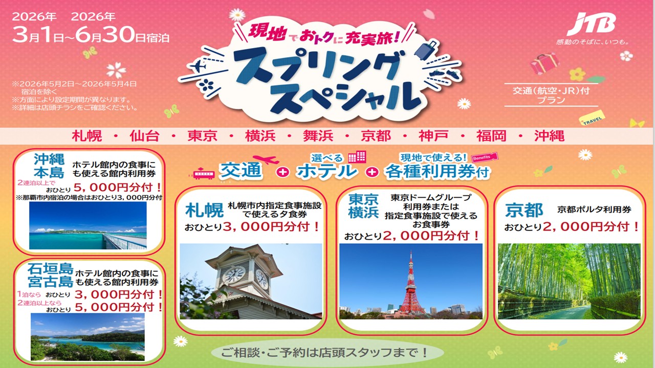 特集ページでは、お得なクーポン情報もご紹介!この春は、JTBでどんどん旅しよう。