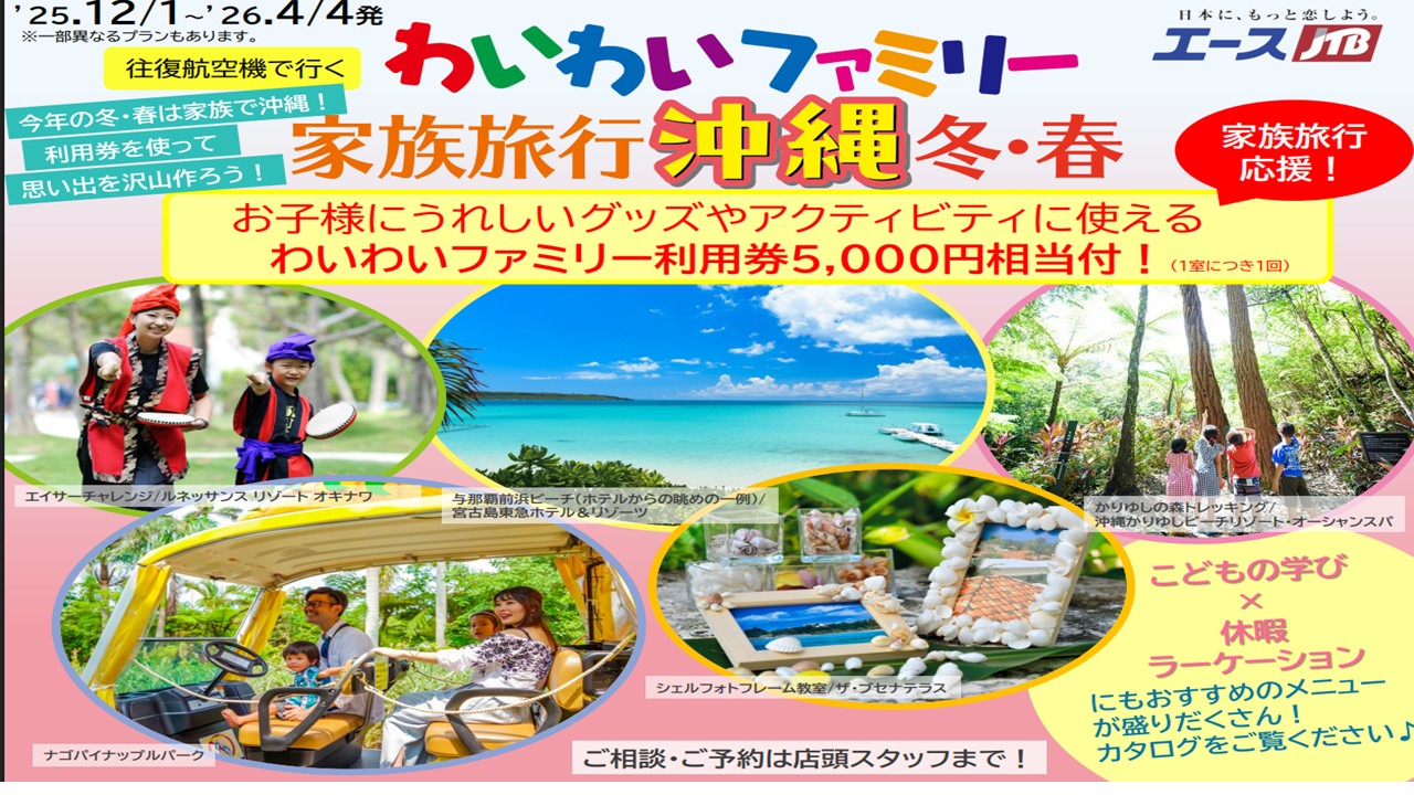 2-18歳のお子様含むご旅行に使えるルックJTBMySTYLEクーポンございます(適用条件あり:詳細は店舗スタッフまで)