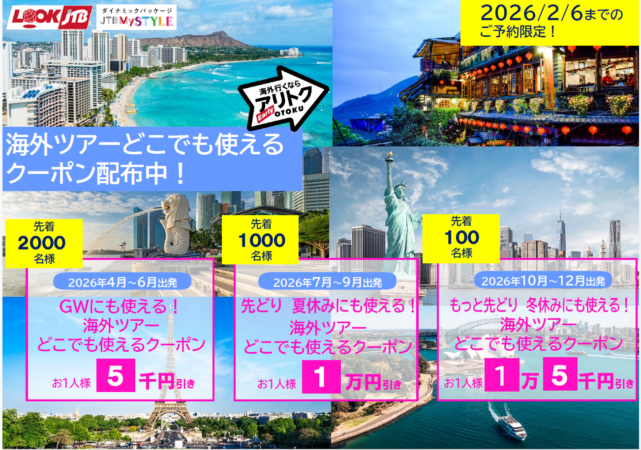 対象期間内にご旅行をお申込みのお客様にご旅行代金に使える割引クーポンを配布中!