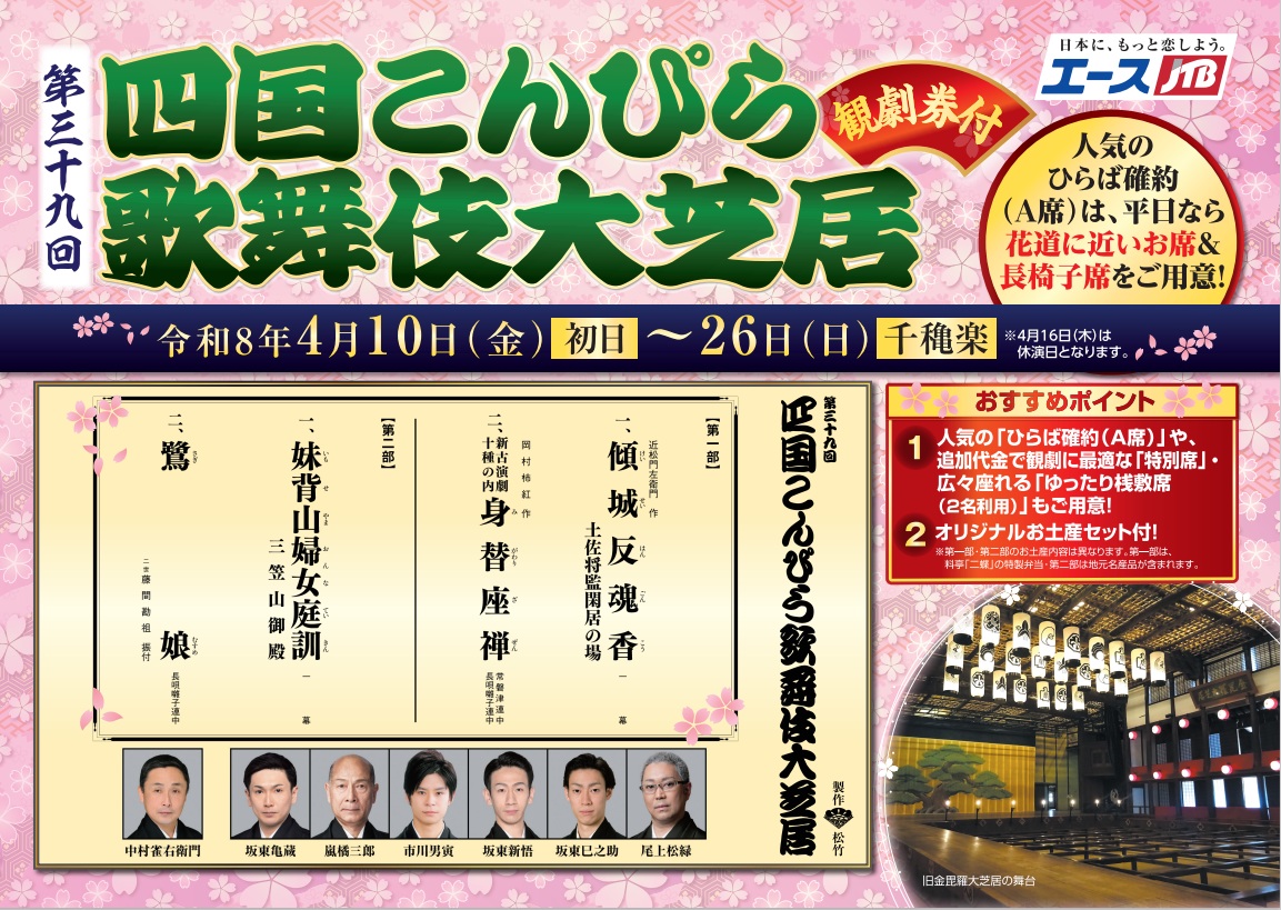 人気の「ひらば確約(A席)」をはじめ、追加代金で「特別席」や広々とした「ゆったり桟敷席(2名利用)」も選択可能。さらに、「ひらば確約(A席)」の平日観劇なら花道に近い長椅子席を確約。全プランにオリジナルお土産セット付きで、第一部は料亭「二蝶」の特製弁当、第二部は地元名産品をご用意しています。現存する日本最古の芝居小屋の人力舞台装置や江戸時代の雰囲気を体感しながら、春の風物詩である歌舞伎公演をお楽しみいただけます。