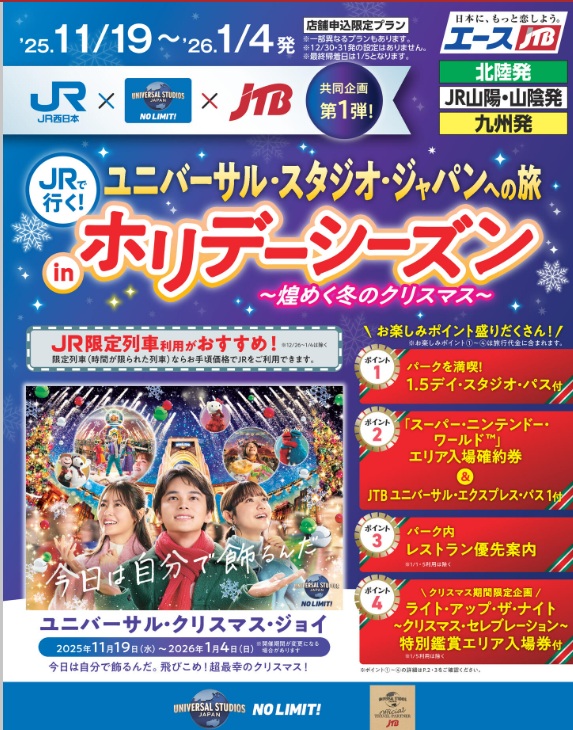 パークをたっぷり楽しめる「1.5デイ・スタジオ・パス」や、JTBユニバーサル・エクスプレス・パス1&「スーパー・ニンテンドー・ワールド 」 エリア入場確約券付。 さらに、人気レストランの優先案内や、クリスマス期間限定のスペシャル・ショーを特別鑑賞エリアでご覧いただける入場券などこのシーズンを存分にお楽しみいただける内容となっております。設定期間は11/19~1/4出発、JRセット限定のプランです。