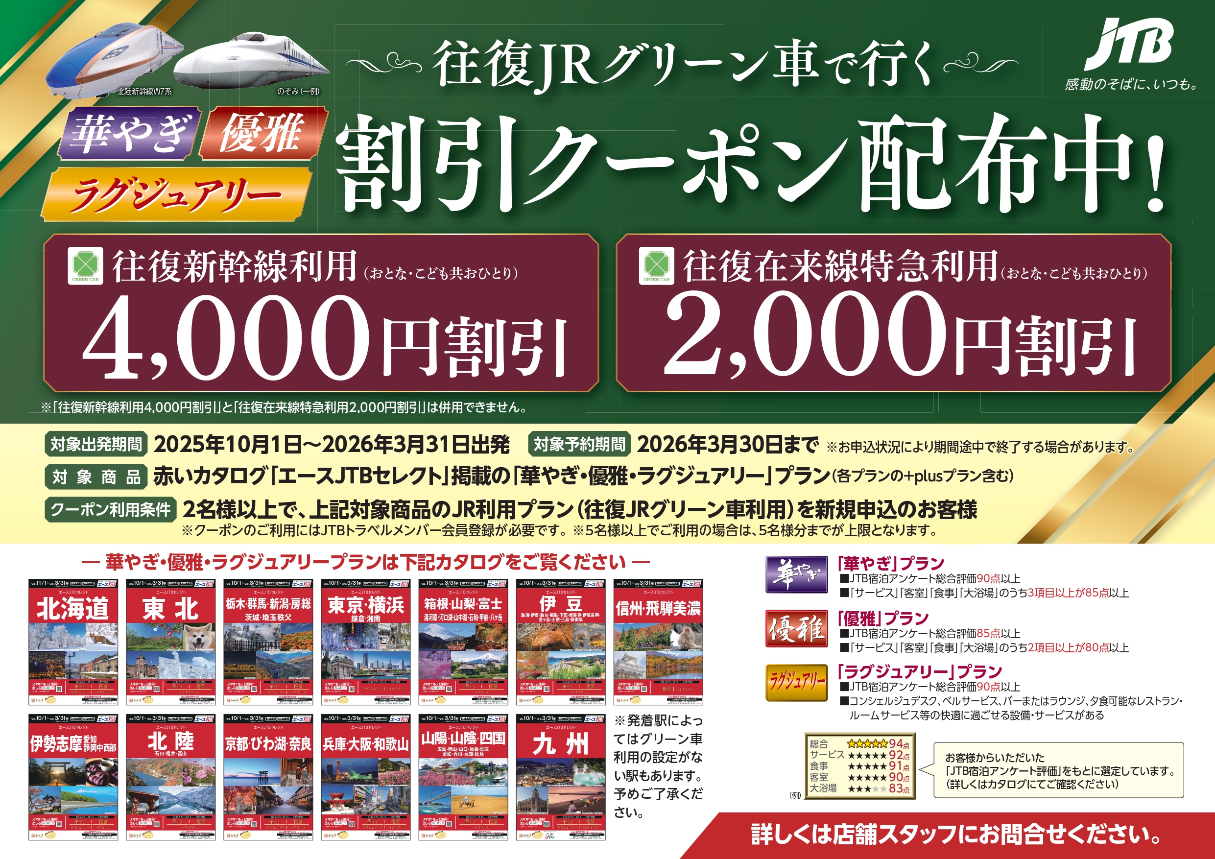 JR付きの商品では、少しリッチに♪グリーン車を使ったプランがお得になりますよ☆(一部プラン除く)