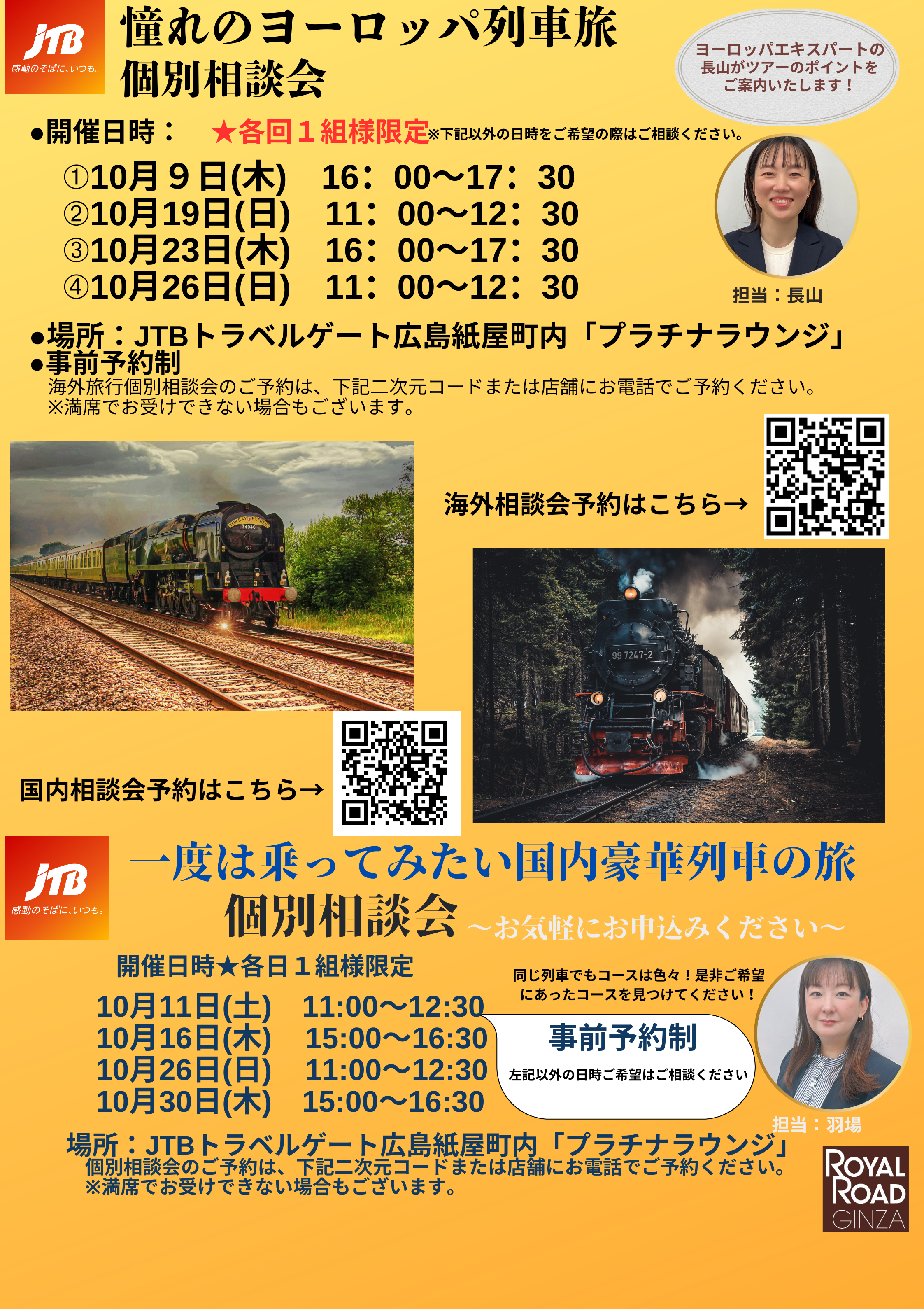 一度は体験したい鉄道の旅、各コースのポイントや列車毎の特徴についてご説明、個別にゆっくりご相談を承ります。