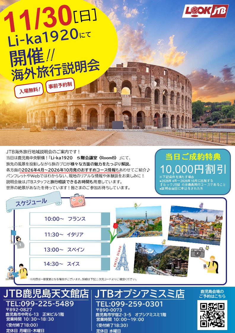 ルックJTB 海外旅行大説明会 鹿児島にて開催決定!!