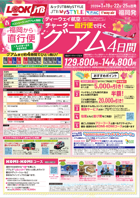 福岡から直行便で行く、グアム4日間の旅が 129,800円~ 好評発売中!