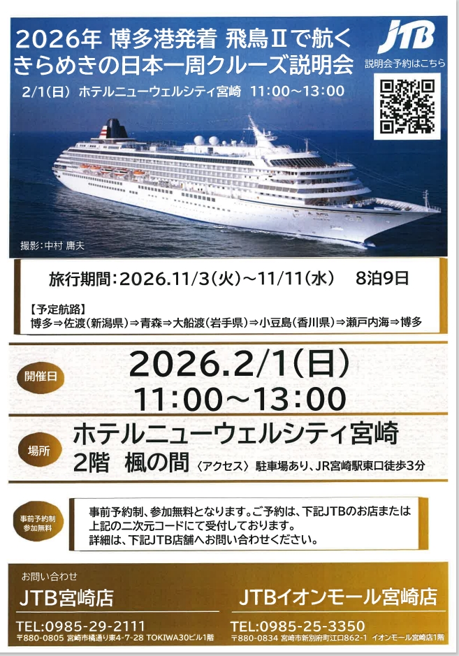 *事前予約制、参加無料となります。ご予約は、下記JTBのお店または