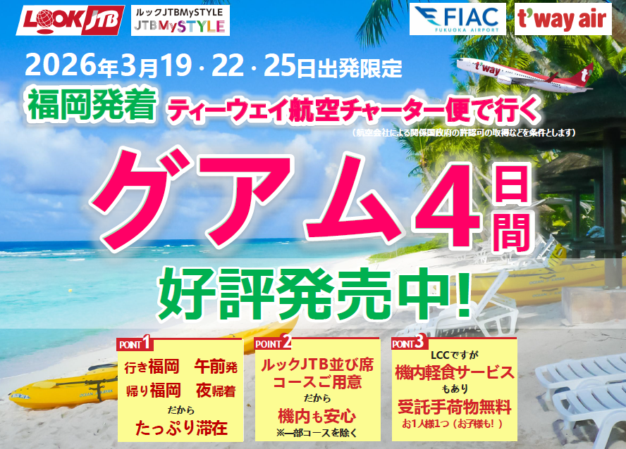 福岡から約4時間で常夏の楽園グアムへ!午前発・夜帰着で滞在時間たっぷり。〇ホテルはL~Cグレードまで10ホテル25カテゴリーから選択可能。