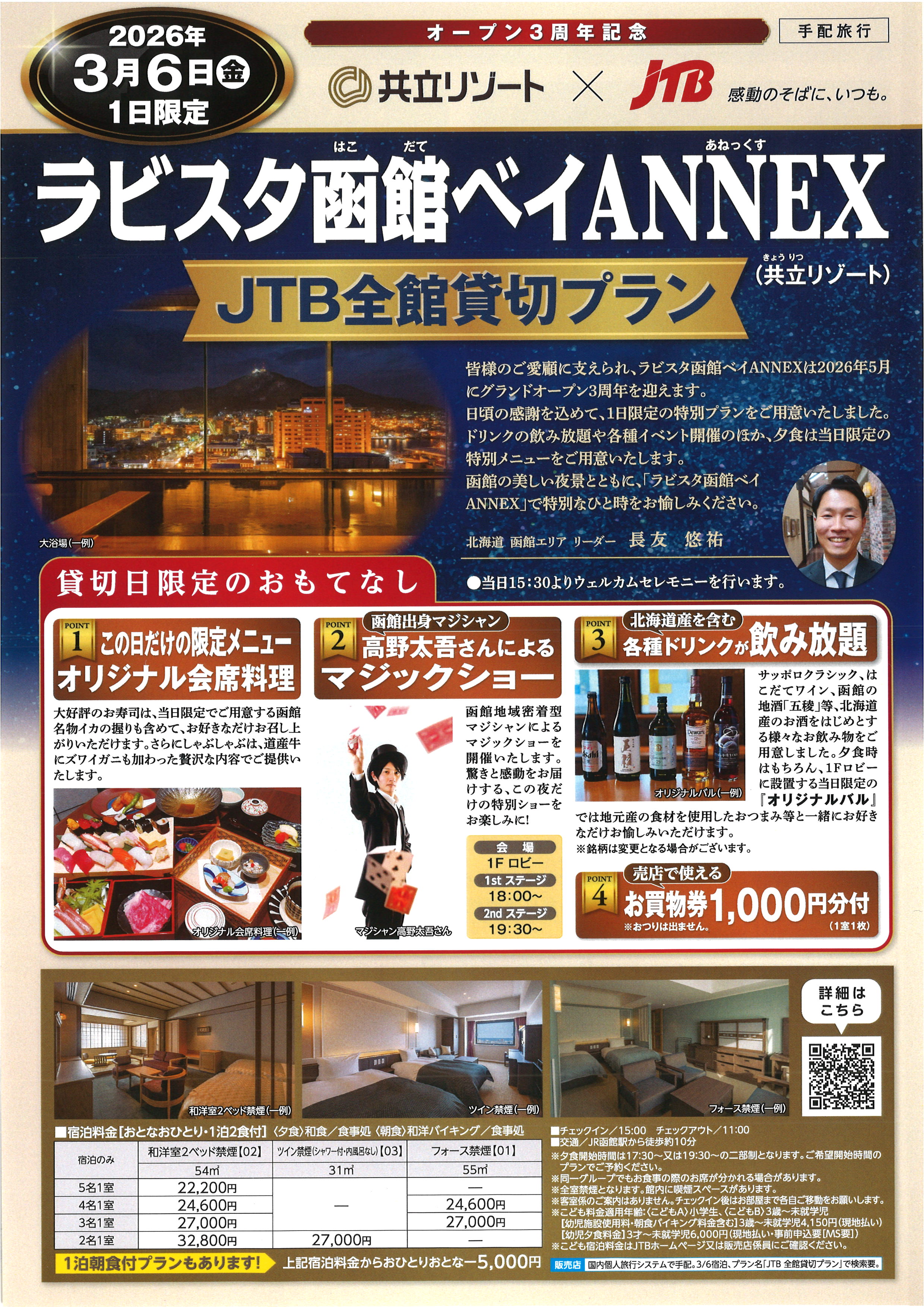 函館の夜景を望むラビスタ函館ベイANNEXを、JTBが一夜限りで完全貸切。洗練された空間と、北海道ならではの美食・美酒を心ゆくまでお楽しみいただける、特別な一日をご用意しました。