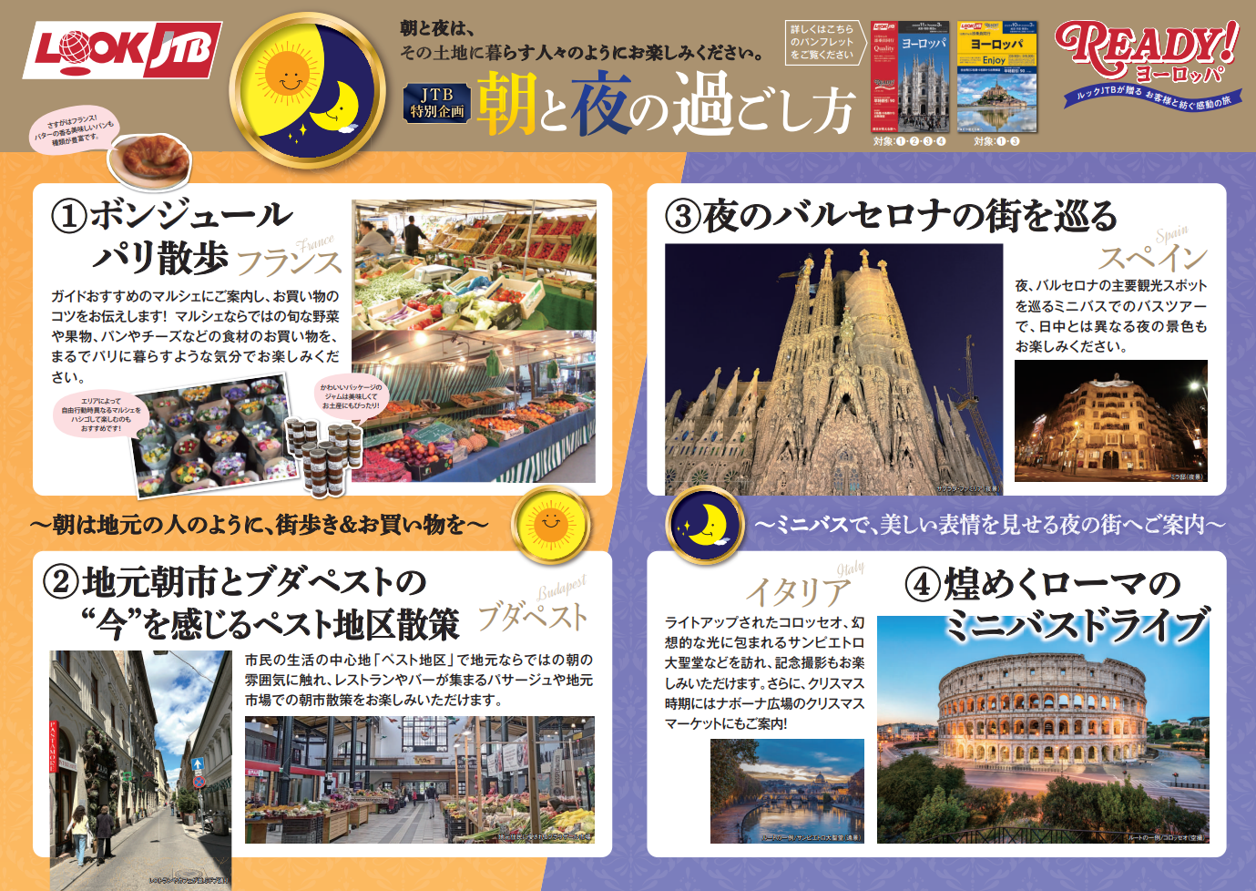 「ボンジュールパリ散歩」(パリジャンの暮らしに根ざしたマルシェを体験!)、「煌めくローマのミニバスドライブ」(ライトアップされたコロッセオ、幻想的な光に包まれたサンピエトロ大聖堂など夜のローマをお楽しみいただきます)等