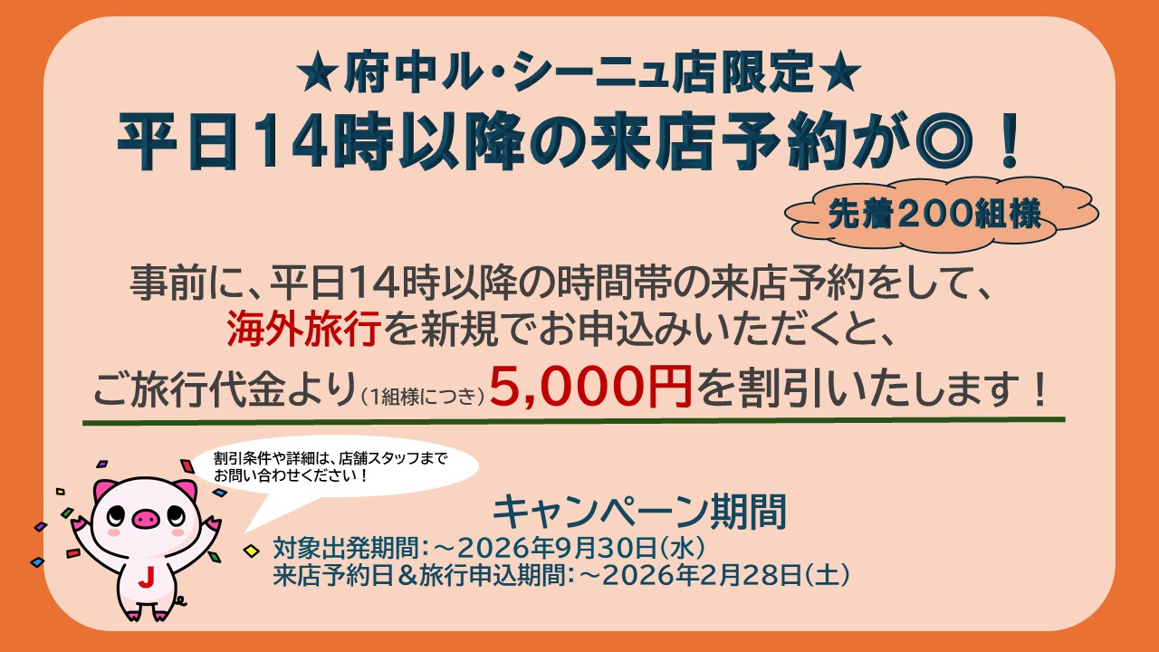 当店ホームページから平日14時以降にご来店予約いただき、海外旅行をお申し込みのお客様へ、先着順で1組様につき5,000円を特別割引いたします!✨