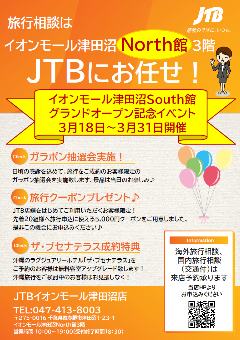 ぜひこの機会にイオンモール津田沼 North館 3階JTBへお越しくださいませ。