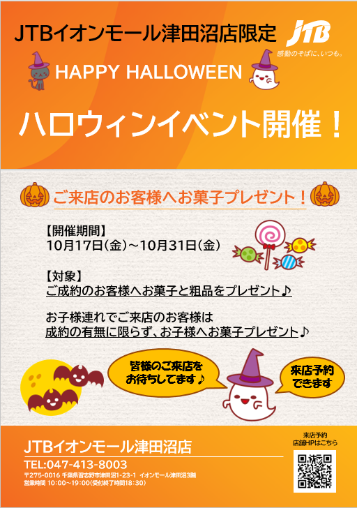 👻期間中のご旅行ご成約者様、ギフト券などご購入いただいたお客様にお菓子をプレゼント👻