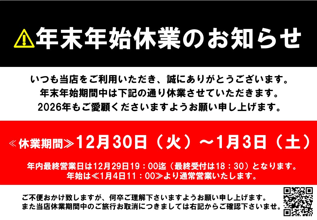 誠に勝手ながら、年末年始は下記の日程で休業させていただきます。