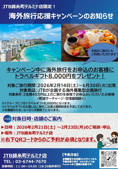 対象店舗:首都圏エリア(東京都・千葉県・神奈川県・山梨県)のJTB対象店舗にてお申込み